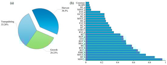 (a) Percentage importance of features at different growth stages (b) Normalized importance sorting of crop classification features, where NDVI_t represents the NDVI value at the transplanting period, and similarly NDVI_g and NDVI_h represent the NDVI values at the growing and maturing periods, respectively.