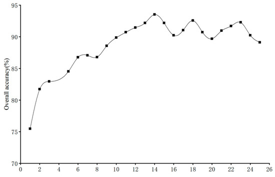 According to the optimal dimensional–discrimination method of the selection of feature variables described in the above section, the OA change as the feature variables are added one by one as shown in Figure 7. It is shown that the overall accuracy of paddy rice identification reaches the maximum when the number of features reaches 14, and then the OA decrease slightly and tend to fluctuate in a certain range as the number of feature variables increases. Therefore, the optimal number of subsets of feature factors for model input is 14, which means that the first 14 features in descending order of importance are identified as the final optimized feature combinations.