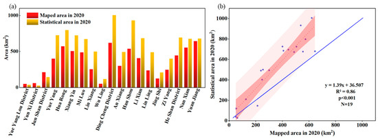 We compared the rice cultivation map with agricultural statistics in 2020 using 19 county-level administrative districts in the Dongting Lake area as the statistical unit (Figure 13). At the same time, we conducted correlation analysis and significance analysis and concluded that there is a significant linear relationship between rice mapping products and statistical data, with a coefficient of determination R2 of 0.86, and a significant correlation at the level of p < 0.001. Meanwhile, the RMSE were 217.5 km2. It is worth noting that most of the paddy rice cropping fields extracted, based on the county-level model, was smaller than the statistical sown area with a relative error of 32.85%. The reasons for this situation were mainly the difficulties in implementing large-scale mechanized planting in areas with complicated terrain, the existence of many abandoned paddy fields and conversion of paddy fields, and the inconsistency between the data on paddy fields reported by farmers and the actual data on cultivated areas in the current year.