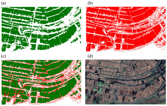 Our maps are compared with rice mapping results based on time-series NDVI spectral features; where (a,b) are the rice results from this study and the rice mapping results based on a single spectral feature, respectively; (c) are the overlay of the two results to highlight the differences; (d) are high-resolution Google Earth image data.
