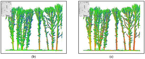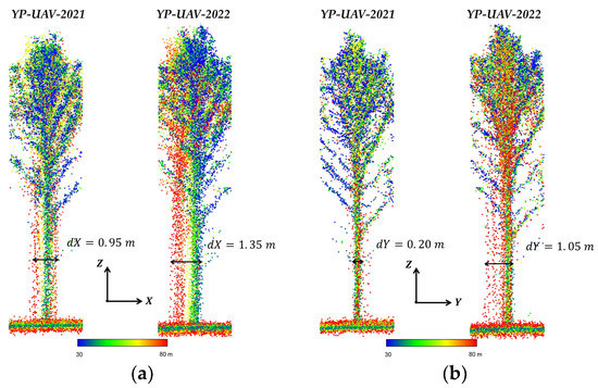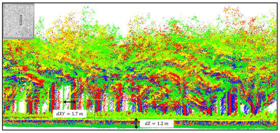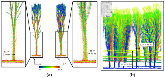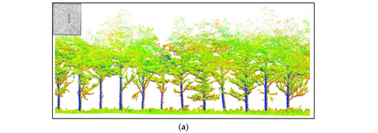 - Absolute accuracy of derived point clouds: Since the two UAV datasets over the young plantation were collected in different years using different systems, well-aligned point clouds from such datasets indicate that the conducted system calibration and trajectory enhancement framework achieved high absolute accuracy for all acquired UAV datasets. Then, results from the UAV datasets were used as references to analyze the absolute accuracy of the Backpack point clouds after trajectory enhancement for the young and mature plantations. The above comparison was performed qualitatively and quantitatively. The former was conducted by visually checking the alignment of point clouds from different datasets for a profile and/or individual trees. The latter utilized the refined parametric model of extracted/matched terrain and tree trunk features for numerical evaluation of the quality in the Z and X/Y directions, respectively. More specifically, the X and Y coordinates of established seed points for terrain patch extraction were used to derive the Z coordinates from the respective refined plane parameters for each dataset. The differences between the Z values for each terrain patch represented the alignment degree in the vertical direction. For tree trunk features, a point on the refined cylinder axis was derived by setting a common Z coordinate for each dataset (e.g., the Z coordinate of the seed point used for tree trunk extraction from the reference dataset). The derived X and Y coordinates of that point were regarded as the planimetric tree location. The absolute accuracy in the X and Y directions was then estimated using the planimetric distances between respective tree locations from different datasets.