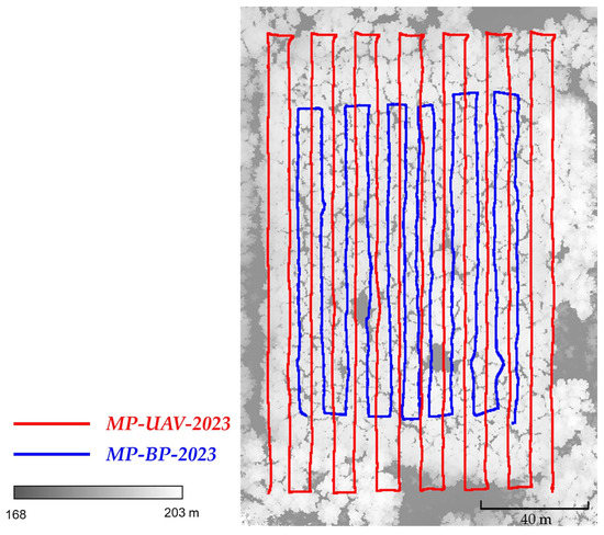 - MP-BP-2023: Due to the extended periods of GNSS signal outages, the GNSS/INS-derived trajectory was of lower quality. For this dataset, trajectory enhancement was first conducted using solely Backpack LiDAR (Test 1). Then, the MP-UAV-2023 data were included as a reference for trajectory enhancement of the Backpack dataset (Test 2). In this test, LiDAR features from the Backpack and UAV datasets were simultaneously included in the LSA, while refined mounting parameters and trajectories for the UAV dataset were treated as errorless.