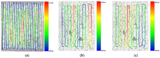 - Estimated trajectory corrections: The evaluated corrections for the high-frequency trajectory (i.e., following the interpolation process while using estimated corrections for the reference points) were used to illustrate the required trajectory changes to ensure better alignment for the point cloud. Statistical measures (mean and STD) and magnitude of the corrections for individual poses were reported in a tabular form and visualized using a color-coded trajectory with the colors representing the magnitude of applied corrections.