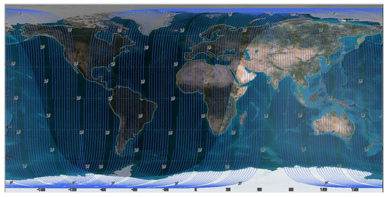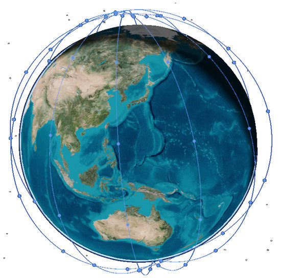 The LEO satellite constellation can be divided into two categories, namely the inclined-orbit-based Walker Delta constellation and the polar-orbit-based Walker Star constellation. As shown in Figure 1, the Iridium constellation [9], a typical polar-orbit constellation, has been studied by many scholars as a low-orbit constellation because of its representative constellation configuration and easy mathematical model construction.