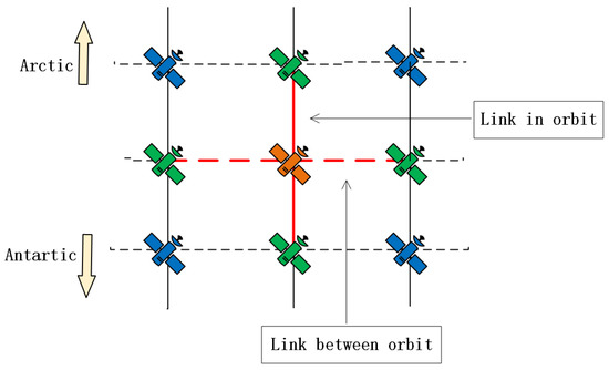 In this paper, the Iridium satellite, a typical polar LEO constellation, is taken as the research scene. The Iridium constellation has six polar orbits, and 12 LEO satellites are distributed on each orbit, including 11 communication satellites and one standby satellite. In total, there are satellites in the whole constellation. The interorbit inter-satellite links change periodically with the movement of satellites. The connectivity of the inter-satellite link changes periodically with the motion of the satellite. The satellites in the first orbit move in opposite directions to the satellites in the sixth orbit; so, there is no direct communication between the satellites in the two orbits. As shown in Figure 4, in a typical constellation, there are up to four inter-satellite links around a satellite, connecting it to four satellites, two of which are in the same orbit and two in adjacent orbits. Communication between satellites with an inter-satellite link is possible.