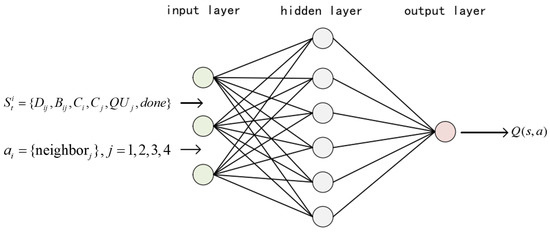 On the basis of Q-learning, the DQN algorithm combines deep learning, which can deal well with the problems of a continuous state and a discrete action space. In the continuous state space, the algorithm does not need to maintain a large number of Q tables. The DQN algorithm can adapt to the continuous state space. Due to the large state space, a deep neural network can be used to perform nonlinear fitting of the action value function. The input of the neural network was the current state s and the action a, and the output was the action value function , as shown in Figure 8. The DQN algorithm reduced the correlation between the training data through experience replay technology so as to make the neural network training more stable. At the same time, the DQN also used the target network to update the temporal difference (TD) bias, which further reduced the temporal correlation between pieces of the training data. The experience replay technology stored the state transition of the interaction with the environment in the experience replay pool. The DQN algorithm used a target network with the same structure as the online network. This target network was periodically updated by copying the parameters from the online network. By using the target network to generate target Q-values, the temporal correlation between the fragmented sample data was reduced, leading to a more stable training process.