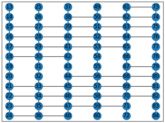 In this work, we employed the Win11 64-bit system, used the Python torch deep learning framework, and utilized the programming language Python3.9 to carry out the simulation experiments and analyze the results. The experiment was carried out under the constructed Iridium satellite model, and the Iridium satellite topology was generated by using the official satellite data files of the Iridium constellation and Python networkX. As shown in Figure 10, the generated Iridium constellation contained six orbits, and each orbit contained 12 satellites. At the same time, the delay and bandwidth were randomly generated for each inter-satellite link. In order to simulate the dynamic network environment in the topology below, 70 streams of data flow were generated in a loop at the same time to propagate in the topology, so that the agent could obtain dynamic queue utilization and link bandwidth.