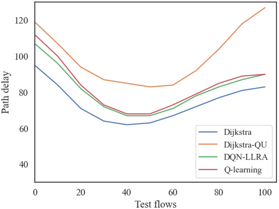 From Figure 12, it can be seen that in the test with 100 pairs of source–destination nodes, the Dijkstra algorithm had the lowest latency among the four algorithms. In contrast, the Dijkstra-QU algorithm with queue utilization as the optimization objective had the highest latency. The DQN-LLRA algorithm proposed in this paper and the Q-learning-based routing algorithm both considered the impact of queue utilization, and their latency performance was between the Dijkstra algorithm and the Dijkstra-QU scheme. Obviously, the proposed algorithms had better latency performance than the Q-learning-based algorithm.