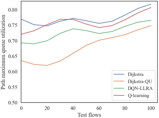 From Figure 13, it can be seen that in the test with 100 pairs of source–destination nodes, the maximum queue utilization rate of the Dijkstra-QU algorithm was the lowest among the four algorithms, while the maximum queue utilization rate of the Dijkstra algorithm was the highest. The maximum queue utilization rate of the proposed DQN-LLRA algorithm and the Q-learning-based routing algorithm was between the Dijkstra algorithm and the Dijkstra-QU scheme.