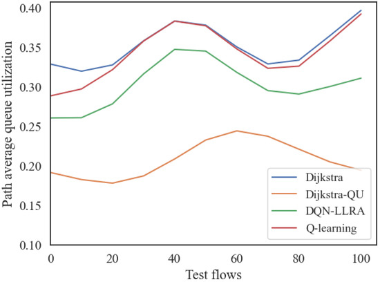 From Figure 14, it can be seen that in the test with 100 source–destination node pairs, the average queue utilization rate of the Dijkstra-QU algorithm was the lowest among the four algorithms, while the average queue utilization rate of the Dijkstra algorithm was the highest. The average queue utilization rates of the proposed DQN-LLRA algorithm and the Q-learning-based routing algorithm were between the Dijkstra algorithm and the Dijkstra-QU scheme. Moreover, the proposed DQN-LLRA algorithm showed a lower queue utilization rate than the Q-learning-based algorithm.
