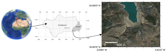 The Benínar Dam is located on the Río Grande de Adra in the municipality of Benínar, in Almería Province, SE Spain (Figure 1). The Río Grande de Adra originates in the Sierra Nevada and receives water from several tributaries. The Benínar Reservoir collects water from a basin of 521 km2 with an average annual contribution of 45 hm3. The dam was constructed using local materials with a inclined clay core. Its reservoir, which is located in an area with highly variable rainfall, covers an average area of 235 ha and experiences an annual average of approximately 450 mm of rainfall [30].