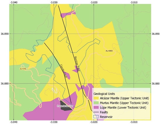 Two primary formations make up the reservoir’s location: the lower tectonic unit (UTI, Lújar Mantle) and the upper tectonic unit (UTS, Alcázar & Murta Mantles) (Figure 2). Both formations have similar stratigraphy, with an upper level of Upper Triassic carbonate lithologies (limestones and dolomites) based on a Permian–Triassic level of schists and phyllites, which are arranged at the base or interspersed between the carbonaceous-gypsiferous formations [31]. The upper tectonic unit is distributed throughout the central and northern zones of the reservoir, while the lower tectonic unit dominates at the dam site [28].