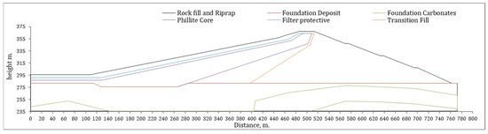 According to the geometric characteristics of the dam and in accordance with Article 3.1 of the Technical Regulation for Safety of Dams and Reservoirs [35], the dam is classified as a large dam and falls under Category A. The geotechnical characteristics of the different materials used in the reservoir basin were studied and characterized (Table 1).