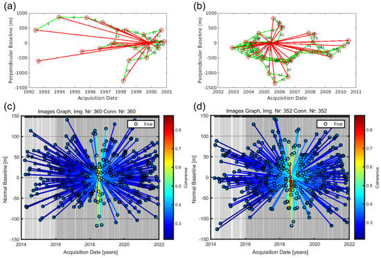 The ERS-1/2 and Envisat datasets were processed using a combination of two MT-InSAR methods (PSI and SBAS) implemented with StaMPS-MTI software [19,20,46] a package developed in collaboration by Stanford University (Stanford, CA, USA), University of Iceland (Reykjavík, IS), Delft University (Delft, NL), and University of Leeds (Leeds, GB). Figure 4 shows the distribution of temporal vs. perpendicular baselines for each dataset. Figure 4a,b display the image connections for each method, which are represented in red for PSI and in green for SBAS combinations. Sentinel-1A/B data were analyzed using the standard PSI technique (Figure 4c,d) and implemented via SARPROZ software [47,48].