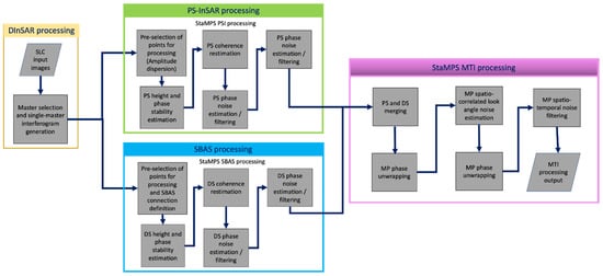 The identification of pixels for time-series analysis was based on single-look interferograms that exhibit coherence in time. One of the advantages of the StaMPS-MTI method was its capability to perform 3D phase unwrapping in both spatial and temporal domains, allowing for retrieval of absolute phase values for each pixel. With StaMPS-MTI, the final selection of measuring points obtained with PSI and SBAS could be merged to obtain the final processing output [19] (Figure 5).