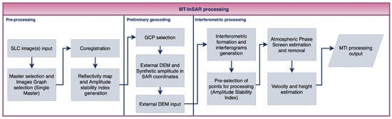 Among MT-InSAR techniques, we used the classical PSI. Its main objective is to estimate the relative height and displacement of persistent ground scatterers through the analysis of stable electromagnetic signatures in the interferometric phase, i.e., temporal phase differences (Equation (1)).