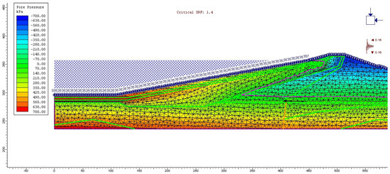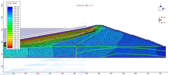 Upon analyzing the stress distribution in Figure 9, it can be observed, as evidenced by the representation of the resistance factor, that tensions appear in the aforementioned strips, potentially affecting the phyllites’ nuclei in contact with the filter and the rock fill shoulder. The isoline of null values is also visible, and the magnitudes of the detected tensions do not exceed 1.2 Kp/cm2.