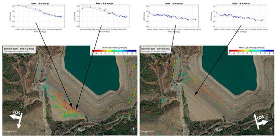 One of the main advantages of MT-InSAR is its ability to monitor the dam and surrounding area at a low cost per unit of monitored land. These benefits are highlighted in other studies, as well as the main limitations, including vegetated areas, water or wetted areas, and sudden movements [56]. MT-InSAR was demonstrated to enable the control of landslides, slopes, auxiliary infrastructures, and the dam body with the same processing effort. This finding is particularly important since projected monitoring systems typically do not record with the same frequency and precision throughout the dam’s lifetime.