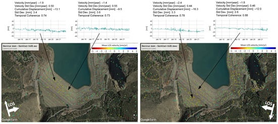 For SARPROZ processing, all available SLC images were co-registered on a unique master acquisition. The data were then analyzed on a pixel-by-pixel basis to identify a sparse grid of points, usually corresponding to man-made structures (e.g., buildings, bridges, monuments, antennas, poles, conducts, etc.) or terrain features with high reflectivity. These points were identified to filter out atmospheric noise and compensate for topographic artifacts. Precise Orbit Ephemerides (AUX_POEORB) [49] and a digital elevation model were used for removal of the topographic phase component. To identify precise geolocation of PS points, a single Ground Control Point (GCP) was selected from both sensing geometries (ascending/descending). A combination of quality parameters related to the amplitude of the radar signal was used to pre-select points with stable electromagnetic signature, while a threshold on Amplitude Stability Index [50] was used to create this network of pre-selected points with stable electromagnetic signature. A linear model assumption was used for estimating residual height and displacement velocity, and displacement time-series were estimated for each persistent scattering point with respect to the local reference point (Figure 6).