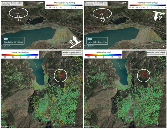 MT-InSAR monitoring of Benínar Dam: mean deformation velocity (mm/year) in line-of-sight (LOS) from Sentinel-1 ascending orbits (left) and descending orbits (right) between 2015 and 2021 (up: 3D view; low: plan view with zonation).