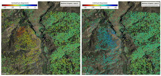 (Left): Cumulative displacements in vertical direction for period 2014–2021 in area of Darrical village (zone 3). (Right): Cumulative displacements in East–West direction for period 2014–2021 in area of Darrical village (zone 3).