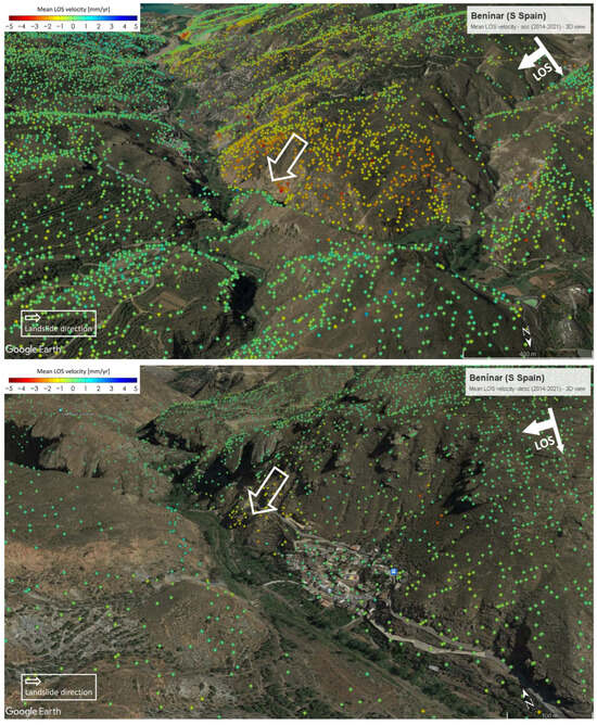 Figure 21 presents the decomposed vertical (left) and E–W (right) velocities. The motion of the large slope on the left (West slope) reveals a movement toward the channel with a vertical rate of subsidence (yellow–orange color) and net movement to the East (blue color). This large slope exhibits vertical movements of about −5 mm/year (downwards) and horizontal movements, toward the East, in the range 6–7 mm/year (Figure 21). This outcome can also be seen in the top image of Figure 22, where LOS velocities indicate the slide movement of the slopes. The bottom image of Figure 22 shows the slope in the background of Darrical village, where a landslide can be appreciated to the North of the village.