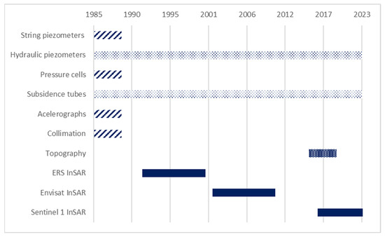 Upon completion of this research, a crucial issue that comes to light is the dependability of various monitoring technologies throughout the lifespan of a dam. Regarding the Benínar Dam, it is worth noting that most of the technologies installed were initially reported as non-operational since at least 2012 [28]. Moreover, the available data are sparse and unconnected, being reduced to topographical measurements from September 2015 to August 2018. In contrast, MT-InSAR provided monthly deformation data from 1992, with small gaps between ERS and Envisat, and prior to the launch of Sentinel-1 constellation (Figure 23).