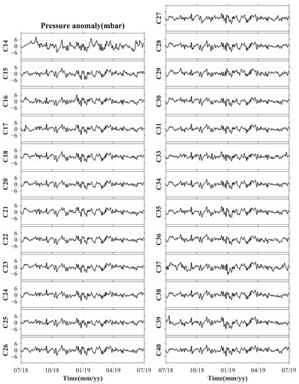 Most of the PIES recorded OBP during the entire observation period, with the exception of C13, C19, and C32. Specifically, C13 may have moved, C19 was not successfully recovered, and C32 had some missing data. Therefore, the OBP data from 25 stations were used in this study. By employing the procedures proposed by Kennelly et al. (2007), the raw OBP records were despiked, detided, and dedrifted [41]. All OBP records were resampled at 1 h intervals and low-pass filtered for 72 h with a fourth-order Butterworth filter. Finally, the recorded time tags were converted to Universal Time Coordinated (UTC). The processed time series of the OBP anomalies are shown in Figure 2. The OBP anomaly records provided by PIES almost entirely cover the area west of LS. These records indicate that the spatial variability of OBP in the northeastern SCS is limited. Specifically, the maximum standard deviation of the spatial differences was only 0.54 mbar (Figure 3), with the largest OBP anomaly amplitude observed at C14 reaching approximately 8 mbar, and the remaining stations showing amplitudes around 6 mbar. Notably, the maximum standard deviation was much smaller than these observed amplitudes, which suggests that there were no significant spatial differences in the OBP variations in the northeastern SCS.