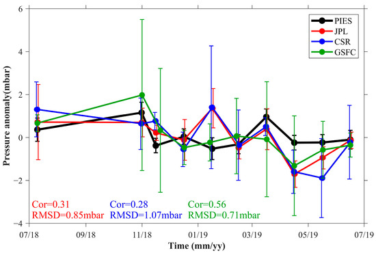Comparison between the station-averaged PIES OBP anomaly (C14–C18, C20–C31, and C33–C40) and the GRACE-FO OBP anomaly from July 2018 to June 2019. Note that the GRACE-FO data for August and September 2018 were missing because of sensor failure. The PIES OBP anomaly is represented by the black line, whereas the GRACE-FO OBP anomaly provided by JPL, CSR, and GSFC are represented by the red, blue, and green lines, respectively. The Cor and RMSD between PIES and GRACE-FO are displayed below the figure. The colors of the text correspond to the colors of the lines JPL (red), CSR (blue), and GSFC (green). Bars indicate the standard deviations of the spatial average.