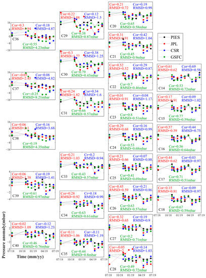 The interpolated GRACE-FO OBP anomalies at each PIES station were then compared to the in situ OBP series (Figure 4). With the exception of C36—C38, the RMSD between GSFC and PIES was 0.4–1.0 mbar, and the Cor of most stations was above 0.4 (C27 and C29 were relatively small at 0.2 and 0.38, respectively). The RMSD between PIES and JPL (CSR) at all stations was 0.5–2.0 mbar (0.5–1.6 mbar) with the exception of C36—C38. The Cor between PIES and JPL (CSR) was less than 0.6 (0.5), with the exception of C14, which was approximately 0.2 (0.1). In addition, the Cor (RMSD) between the mascon solutions of the three institutions and the PIES OBP anomaly was significantly reduced (increased) at C36, C37, and C38. Despite the Cor between the GSFC and the PIES being 0.55 at C36, the RMSD was high at 4.23 mbar. The correspondence between PIES and JPL (CSR) at C36 was also poor, with a Cor of 0.3 (0.18) and a RMSD of 1.94 mbar (4.87 mbar). Additionally, GSFC had a low correlation with PIES at the C37 and C38, with a Cor of only −0.25 and 0.19 and a RMSD of 8.21 mbar and 4.35 mbar, respectively. JPL and CSR also showed a very low correlation with PIES observations and a relatively large RMSD at C37 and C38. Therefore, it can be seen that the mascon solutions from the three institutions had a poor agreement with the PIES records at C36, C37, and C38.