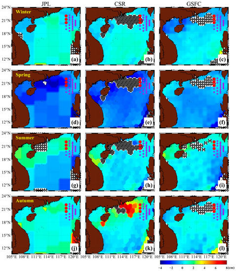The seasonal pattern derived from the GRACE-FO mascon solutions in the SCS from July 2018 to June 2019 is represented at an equivalent water height. JPL (left), CSR (middle), and GSFC (right) are listed, and rows represent winter (a–c), spring (d–f), summer (g–i), and autumn (j–l). Note that the winter in (a–c) is the average of December 2018, January, and February 2019; spring in (d–f) is the average of March, April, and May 2019; summer in (g–i) is the average of July 2018 and June 2019; and autumn in (j–l) is the average of October and November 2018. Red dots represent C36, C37, and C38, whereas purple dots represent other stations. Note that only the GRACE-FO OBP anomaly within the seasonal mean plus or minus the standard deviation of that season were retained. The stippled overlay areas represent the regions in the ocean where the OBP variations were beyond the range of the seasonal mean plus or minus the standard deviation.