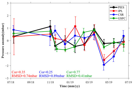 The comparison between the station-averaged OBP anomalies from PIES and GRACE-FO is illustrated in Figure 3. The correlation coefficient (Cor) and RMSD between PIES and GSFC were 0.56 and 0.71 mbar, respectively. The correlation is statistically significant when the p-value = 0.04. The comparison between the mascon solutions provided by the other two institutes (JPL and CSR) and the PIES observations showed that their correlation with PIES observations was lower than that of GSFC, while their RMSD was higher. Specifically, the Cor was 0.31 (p-value = 0.19) and 0.28 (p-value = 0.22) for JPL and CSR, respectively, and the RMSD was 0.85 mbar and 1.07 mbar for JPL and CSR, respectively. As evident from the vertical bars in Figure 3, the spatial variability of the GRACE-FO mascon solutions was considerably more pronounced than that of the PIES observations.