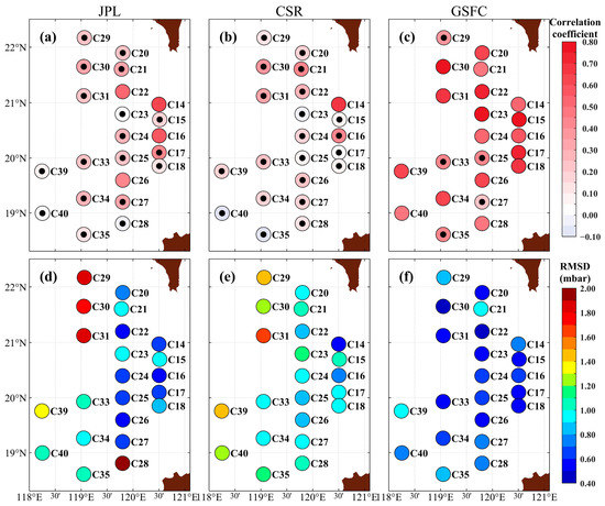 The Cor between the GRACE-FO OBP series from (a) JPL, (b) CSR, and (c) GSFC, as well as the PIES OBP anomalies. Background colors represent the magnitude of the Cor. A black dot on top of a circle indicates that the correlation at that station is statistically insignificant (p-value > 0.1), while a circle without a black dot indicates that the correlation at that station is statistically significant (p-value < 0.1). Panels (d–f) have the same form as (a–c), but show the spatial distribution of RMSD.