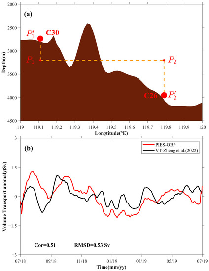 The volume transport anomaly across C26–C30 (red line in Figure 8b) was calculated from the difference between and . The Cor between our calculation and the variations in the deep-layer volume transport of the western boundary current are presented in Figure 14a (from Zheng et al. (2022) [40]). The black line in Figure 8b is 0.51, with an RMSD of 0.53 Sv (1 Sv = 106 m3/s). Although there are some differences between these two estimates, the general agreement is encouraging and underpins the feasibility to monitor the abyssal volume transport anomaly by using the differences in the OBP anomalies. In other words, it is suggested that Equation (3) can be used to calculate the abyssal volume transport variations in SCS as the observed differences may be attributed to the topography effect between (C30) and (C26) (cf. Bingham and Hughes (2008) for a discussion [45].)