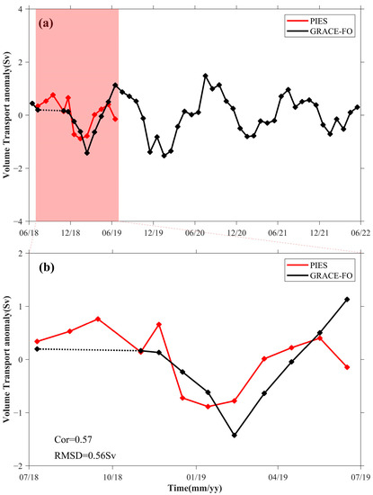 (a) The calculated volume transport anomaly from June 2018 to June 2022 of the C26–C30 section, based on OBP anomalies from PIES (red line) and GSFC mascon solutions (black line). The black dotted line represents that the satellite data are missing here, including but not limited to August 2018 and September 2018. (b) The volume transport anomaly from July 2018 to June 2019, i.e., the shadowed part in (a). The Cor and RMSD are displayed in the lower left corner of the panel.