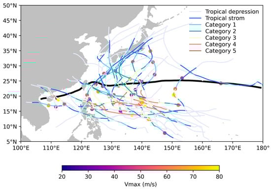 - Knapp, K.R.; Kruk, M.C.; Levinson, D.H.; Diamond, H.J.; Neumann, C.J. The International Best Track Archive for Climate Stewardship (IBTrACS): Unifying Tropical Cyclone Data. Bull. Am. Meteorol. Soc. 2010, 91, 363–376. [Google Scholar] [CrossRef]
