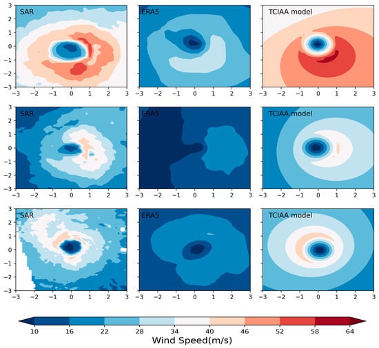 The wind fields of 3 selected TC times in 3RMW, which were located on the cooler sea surface (SST < 26.5 °C): left column is from SAR data, middle column is from ERA5, and the right column is from the TCIAA model.