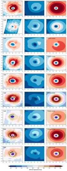 TCs are considered to be intense when they have a small inner-core (or small RMW) and higher maximum winds [36,37]. The TC size can also be represented by R17, which is the radius of the outermost circulation. There were several snapshots (belonging to 12 TCs) with missing values below 30%, and so we first chose one time from each TC as examples. To see the relationship between TC winds and SST, the above 12 times were further divided into two categories based on SST: one was located on the cooler sea surface (SST < 26.5 °C), and the other was located on the warmer (SST > 26.5 °C). The wind fields within 3 radii of the maximum wind (3RMW) from the SAR, ERA5, and TCIAA models over both colder and warmer surface water are shown in Figure 2 and Figure 3, respectively. The three physical parameters calculated from the different products are shown in Figure 4.