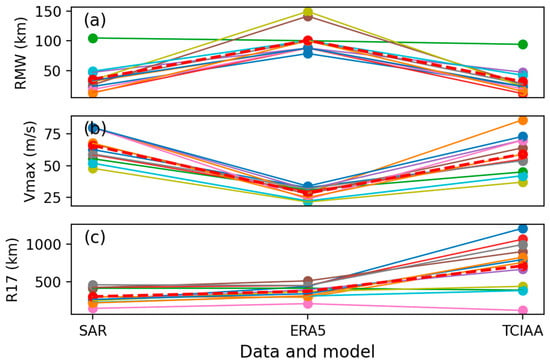 The RMW, maximum wind speed and R17 statistics for all 44 different TCs in the following products: SAR, ERA5, and TCIAA models.