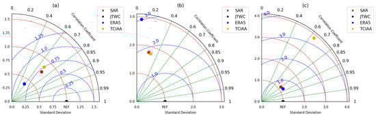 The normalized Taylor diagram of (a) the maximum wind speed, (b) RMW, and (c) R17 between SAR, ERA5, TCIAA, and JTWC data for all the 44 TC times.