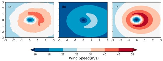 Average wind field distribution after rotation so that the y-axis is the TC translation direction for (a) SAR data, (b) ERA5, and (c) TCIAA models.