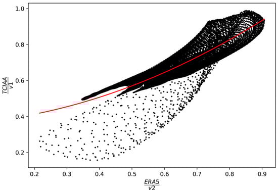 Considering that SAR data are not available for all TCs, while ERA5 data are, we further tried to construct a new TC model based on ERA5 data alone using the above assessment. We first randomly selected 30 times from the 44 TC times and constructed an empirical relationship between SAR observations and the other data products, including the TCIAA model and the reanalysis data mentioned above. We assumed the form of . Note that the first two model terms have been set to ensure that both the spatial pattern and the magnitude in the new wind product are similar to SAR. We derived a, b, and α when the correlation coefficient was the largest and the standard deviation was the smallest between the new data and the corresponding SAR observation. The derived model was , where v1 and v2 were the maximum wind speed in the TCIAA model and ERA5 data, respectively. The empirical relationship between the average coefficients and on each grid was computed and is presented in Figure 7. The scatter diagram shows a rough quadratic relationship, so a quadratic fitting was used to obtain the general relationship between these coefficients. As a result, the final new TC model for the ERA5 data product was where .