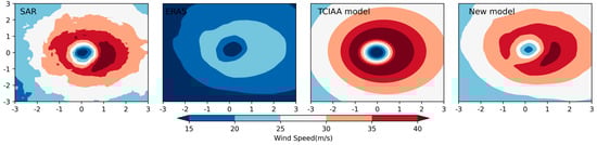 The remaining 14 TC times were used to assess the accuracy of the new ERA5 fitted model. It can be seen that the new model did a much better job describing the average TC wind field than the ERA5 data (Figure 8). In particular, both the spatial distribution and the location of maximum wind speed agreed well with the SAR wind field. The correlation coefficient between the new ERA5 model and the SAR was 0.92 (statistically significant at the 90% confidence level), suggesting that the new model using only ERA5 inputs can be used to reconstruct a reasonably accurate structure of the TC wind field.