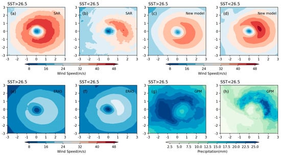 The along-track wind field distribution of (a) SAR, (c) the new model, (e) ERA5, and (g) the distribution of GPM precipitation when SST is higher than 26.5 °C; (b) SAR, (d) the new model, (f) ERA5, and (h) the distribution of precipitation when SST is lower than 26.5 °C.