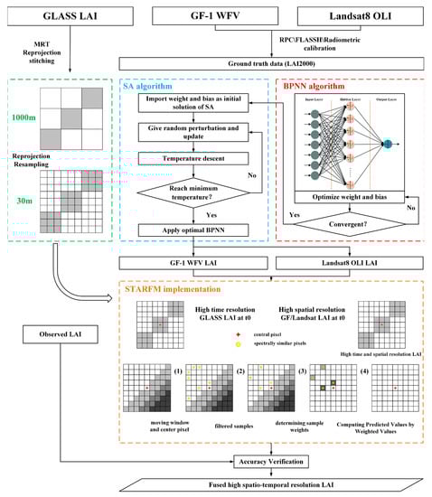 In this study, an SA-BPNN model was established to estimate the LAI using image datasets of the 4-band reflectance of GF-1 WFV or the 7-band reflectance of Landsat8 OLI, and actual measurements obtained from LAI-2000. Then, the estimated LAI was then fused with GLASS LAI. Finally, the fused LAI was compared to the actual measurement data from the LAINet, TRAC LAI, and LAI-2200 datasets with the same resolution for inspection. The main steps of the research included: