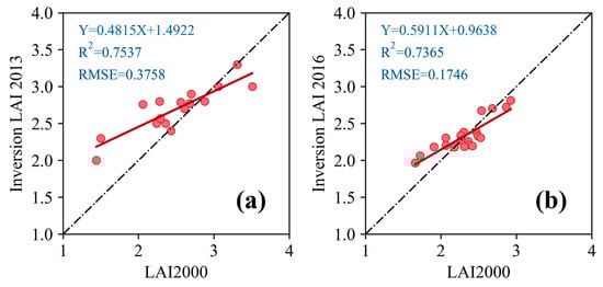 Based on SA-BPNN LAI measured value and inversion value correlation: (a) observations of LAI-2000 plots in 2013; (b) observations of LAI-2000 plots in 2016.