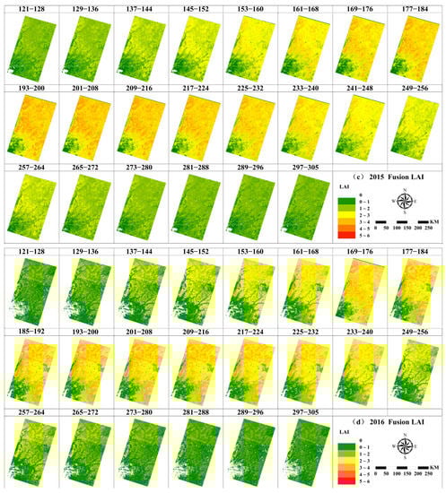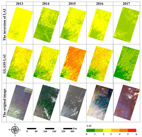 - The estimated GF-1 WFV LAI and Landsat8 OLI LAI were fused with GLASS LAI (2013~2017) using the STARFM model to obtain an LAI with high temporal and spatial resolution in the study area;