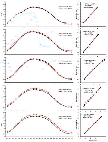 We compared the time series relationship between the fusion LAI and the non-fusion GLASS LAI in the growing season from 2013 to 2017. That is, the average statistics of the fused LAI and the 23 images of the GLASS LAI before the fusion were determined, and the LAI growth season curve every 8 days per year is produced, as shown in Figure 5.