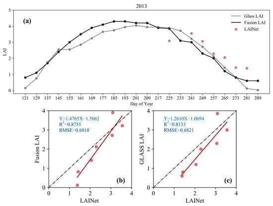 The relationships between (a) Fusion LAI, GLASS LAI and LAINet LAI, and the comparison of (b) Fusion LAI, and (c) GLASS LAI and LAINet LAI.