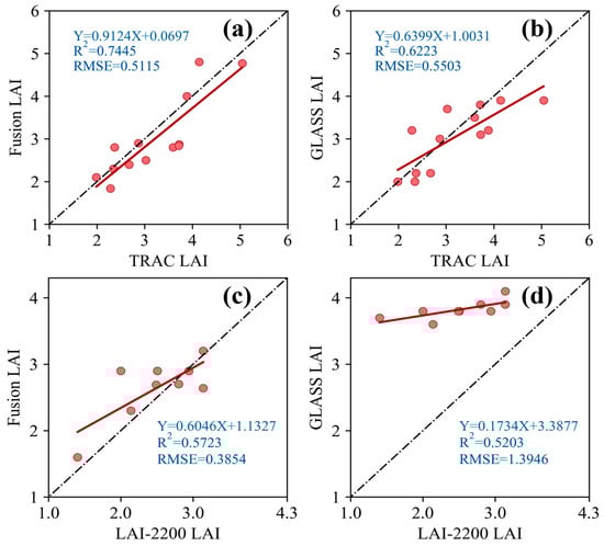The relationships between Fusion LAI, GLASS LAI and TRAC LAI, LAI-2200 LAI, and the comparison of (a) Fusion LAI, (b) GLASS LAI and TRAC LAI; and (c) Fusion LAI, (d) GLASS LAI and LAI-2200 LAI.
